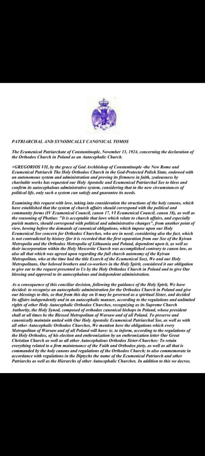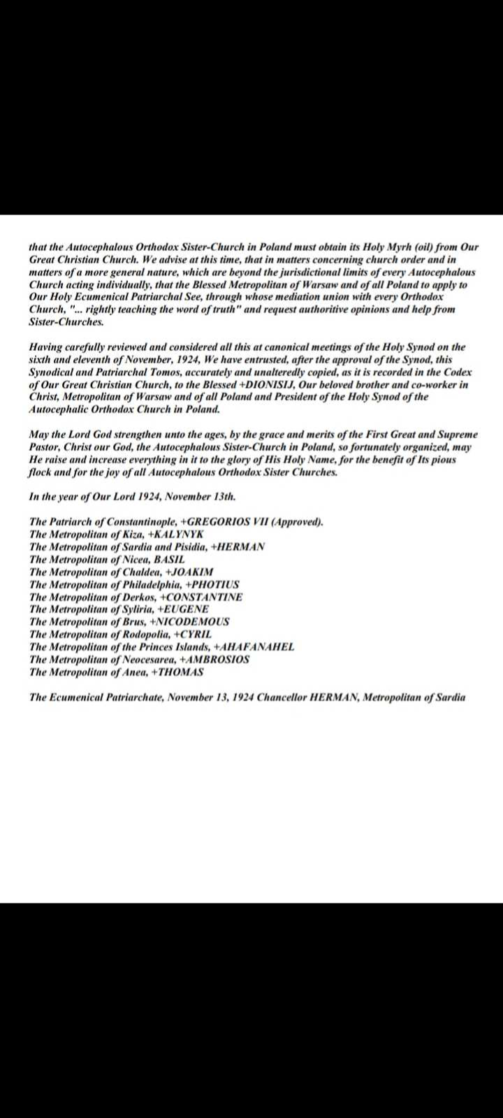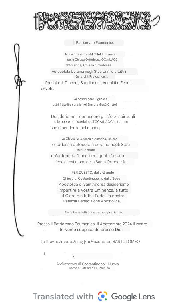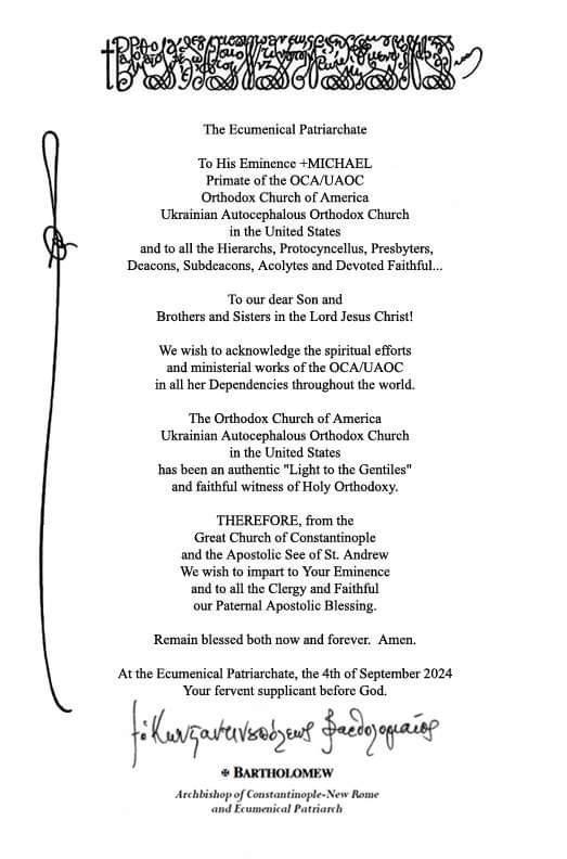 Tomos del 1924, Riconoscimento Ufficiale di tutti gli ordini Ministeriali e dei Sacramenti da parte del Patriarcato ecumenico di Costantinopoli del anno 2018; Benedizione Apostolica e conferma del riconoscimento degli Ordini Ministeriali, dei Sacramenti e della Meritevole Missione Spirituale dell OCA UAOC da parte del Patriarcato ecumenico di Costantinopoli a Settembre 2024